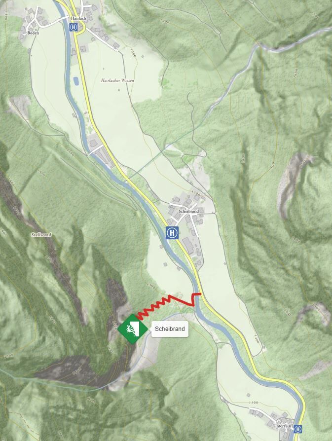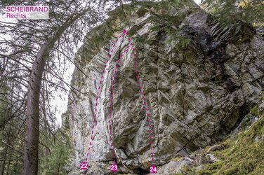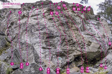 Der Klettergarten Scheibrand befindet sich nach dem Ort Scheibrand auf der rechten (westlichen) Talseite und ist vom Parkplatz aus sichtbar. An der senkrechten bis überhängenden Wand gibt es ausschließlich schwere Routen. Die beste Zeit ist Anfang Mai bis Ende September.