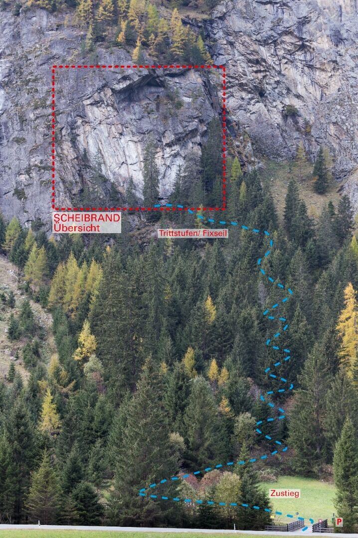 Auf der Pitztaler Bundesstraße L16 von Arzl über Wenns Richtung St. Leonhard fahren. Nach dem Ort Wiese ca. 3,6 km weiterfahren bis zum Ort Scheibrand. Am Ortsende von Scheibrand befindet sich auf der linken Straßenseite das Autohaus Santeler. Von hier noch ca. 100 m weiterfahren, bis rechts eine Brücker über die Pitze kommt. Im Bereich der Brücke gibt es Parkmöglichkeiten.