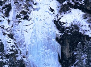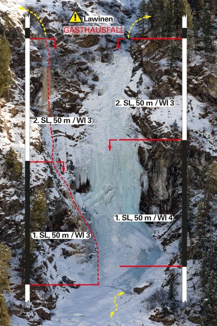 Der Gasthausfall ist ein Eisfall mit bis zu drei Seillängen und bietet mehrere Eisklettermöglichkeiten (WI 2-4). Aufgrund seiner Breite ö nnen mehrere Seilschaften nebeneinander klettern. Besonders bei Kursen sehr beliebter und stark frequentierter Eisfall, der schnell und einfach erreichbar ist. Über den Eisfall mittels Eisuhren und Bäumen abseilen. Oder seitlich vom Eisfall durch den Wald absteigen.