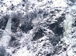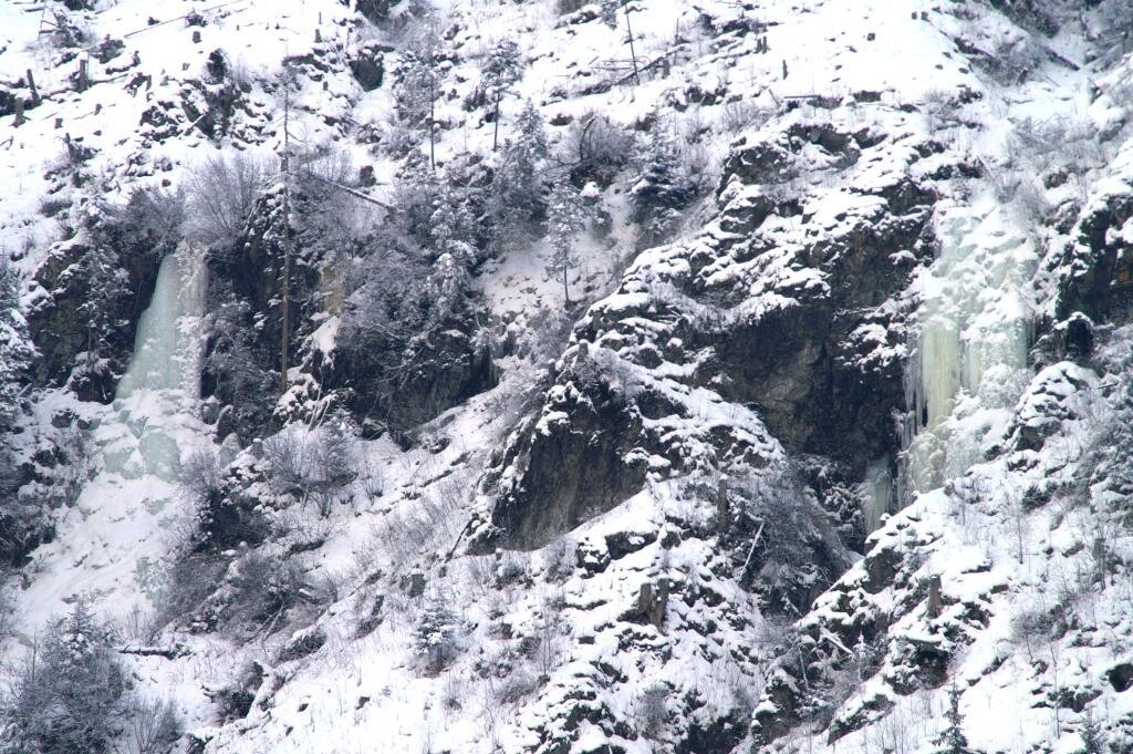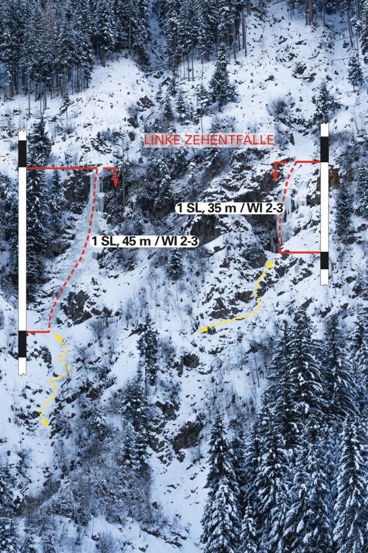 Die Linken Zehentfälle sind zwei kleinere Eisfälle, die sich fast nebeneinander direkt oberhalb der Bundesstraße in einem Kahlschlag befinden. Die beiden Eisfälle sind von der Straße (Melachbrücke) aus gut sichtbar. Über den Eisfall mittels Eisuhren und Bäumen abseilen. Oder durch den Wald seitlich der Eisfälle absteigen.