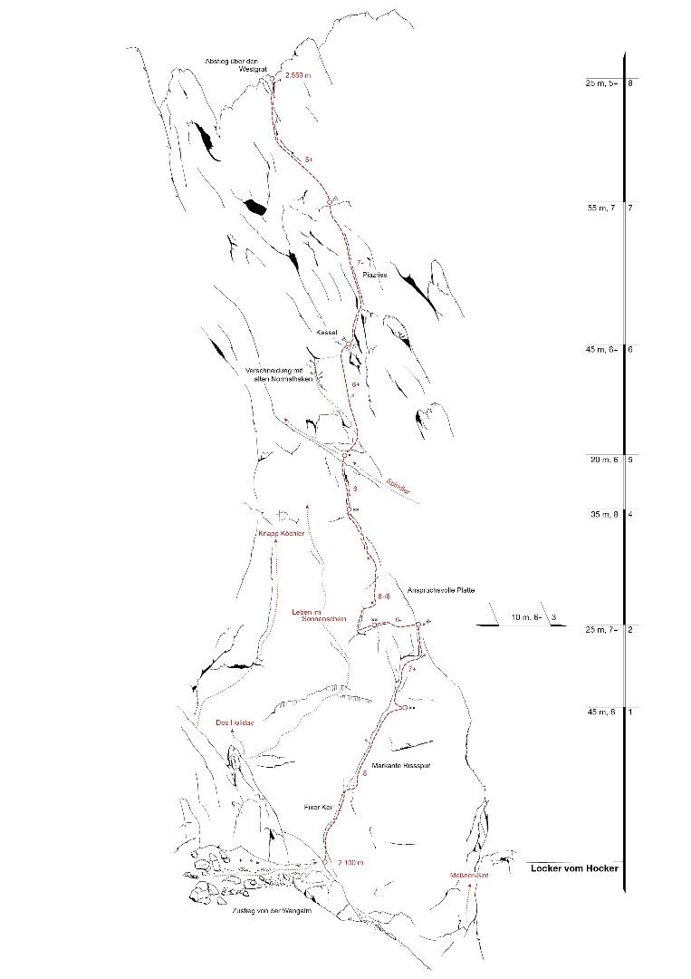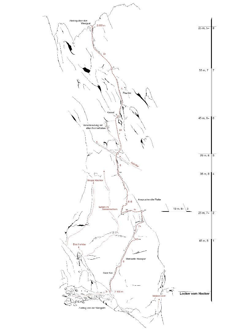 Einer der großen Klassiker der Nordalpen. Bereits 1981 wurde die Route durch die legendäre Seilschaft Güllich/Albert erstbegangen. Auch heute ist sie keinesfalls zu unterschätzen. Vor der ersten Seillänge sollte man sich gründlich aufwärmen, um den sonst sehr wahrscheinlichen „Kaltpump“ zu vermeiden. Es gibt hier viele Möglichkeiten, mobile Sicherungen unterzubringen, jedoch sollte man versiert damit umgehen können und leistungstechnisch sowie moralisch über den Schwierigkeiten stehen. Sonst besteht bis zum ersten Fixkeil akute Grounder-Gefahr. Die zweite Länge ist trotz moderater Schwierigkeiten nicht zu unterschätzen und häufig feucht. Die vierte Länge erfordert ein gutes Gespür für die richtige Tritt- und Griffsequenz und konsequentes Wegsteigen vom ersten Bohrhaken. Hier sollte man dann bis zum zweiten Bolt nicht stürzen, da man sonst ziemlich sicher auf das Band fällt. Häufig wird nach dem Band abgeseilt. Wer keinen Zeitdruck hat, sollte die oberen Längen noch mitnehmen. Diese haben zwar nicht mehr die Felsqualität der ersten fünf Seillängen, sind aber dennoch lohnend.