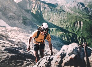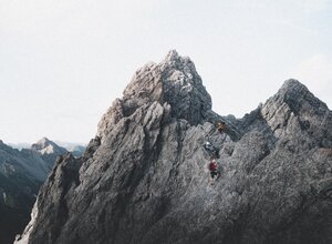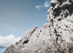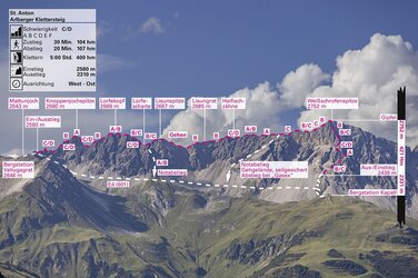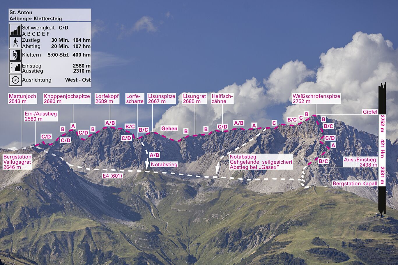 Der 1. Turm weist nach wenigen Metern schon eine Schlüsselstelle auf - einen senkrechten Abstieg von 20 Metern. Um den 2. Turm kann man sich wieder erholen, bevor es wieder zum großen Aufstieg auf die 2.680 Meter hohe Knoppenjochspitze kommt. Es ist die Schlüsselstelle des Klettersteiges, in fast senkrechtem aber doch gut gegliedertem Fels. Nach dem Abstieg vom Gipfel der Knoppenjochspitze geht es leicht auf den Gipfel des Lorfekopfes (2.689 m). Der Abstieg ist etwas schwierig. Wer den Klettersteig nicht in voller Länge gehen möchte, kann jetzt von der Lorfescharte absteigen und gemütlich zum Kapall wandern. Wer Kondition genug hat und weitermacht, geht auf die Lisunspitze (2.667 m) und hinüber über den Lisungrat (2.684 m). Dort und bei den "Haizähnen" geht es über luftige Zacken und Türme. Nach den "Haizähnen" kann man sich wieder etwas erholen, bis die Tour auf den höchsten Punkt, die Weißschrofenspitze (2.752 m), führt. Man genießt nun den herrlichen Tiefblick links ins Almjurtal oder auf das Panorama der Allgäuer Alpen und rechts auf die schönen Schihänge St. Antons. Nach einer kurzen Rast folgt der Abstieg über den Südgrat - mittelsteiler Abstieg- zum Kapall.