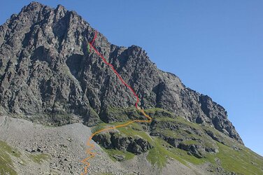 Von der Hütte anfangs auf markiertem Weg nach Norden. Bald weglos über Blockgelände und Gras zum Einstieg auf 2550 Metern.