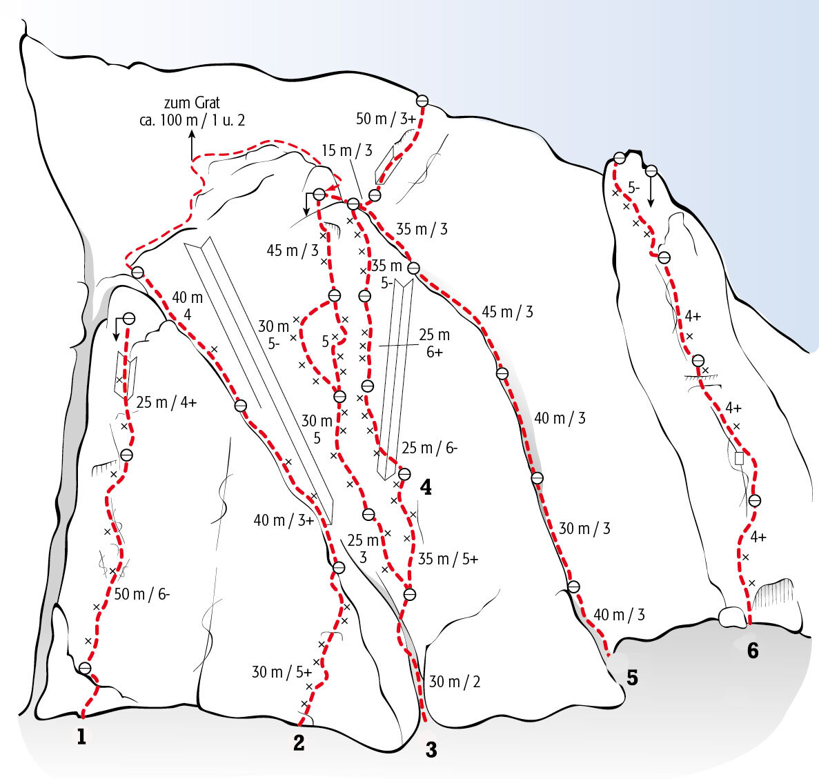 Zustieg: Von der Hütte den Sommerweg entlang ca. 100 Meter hinab zu einer Wiese. Nun in westlicher Richtung zum Bach und diesem abwärts folgen. Man überquert schließlich den Bach an einer markierten Stelle. Rechts aufwärts querend erreicht man nach ca. 40 Minuten die Einstiege.