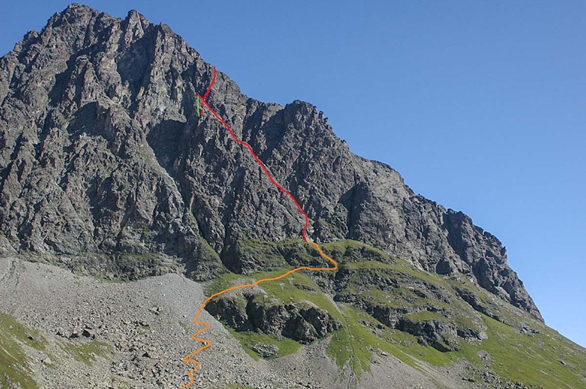 Empfehlenswerte Genusskletterei an meist kompaktem Urgestein. Logische Linienführung entlang der markanten Kante. Nach der 6. Seillänge ca. 20 Meter in eine Scharte abseilen und zu einer markanten Verschneidung gehen. Der weitere Aufstieg erfolgt entlang der wunderschönen Verschneidung. Nach dem 9. Bohrhaken hält man sich leicht rechts und erreicht so den Standplatz. Die letzte Seillänge mündet nach ca. 45. Metern im Ostgrat.