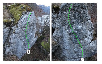 Bei deisem Block ist 1 Boulderroute mit dem Schwierigkeitsgrad 7b+ zu bewältigen.
