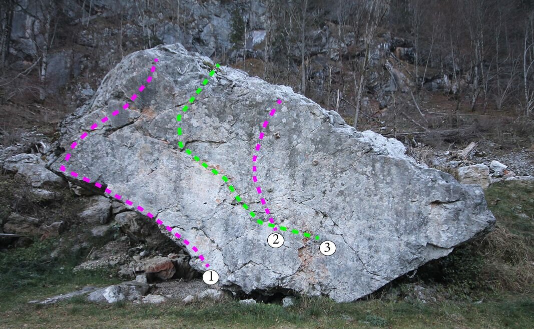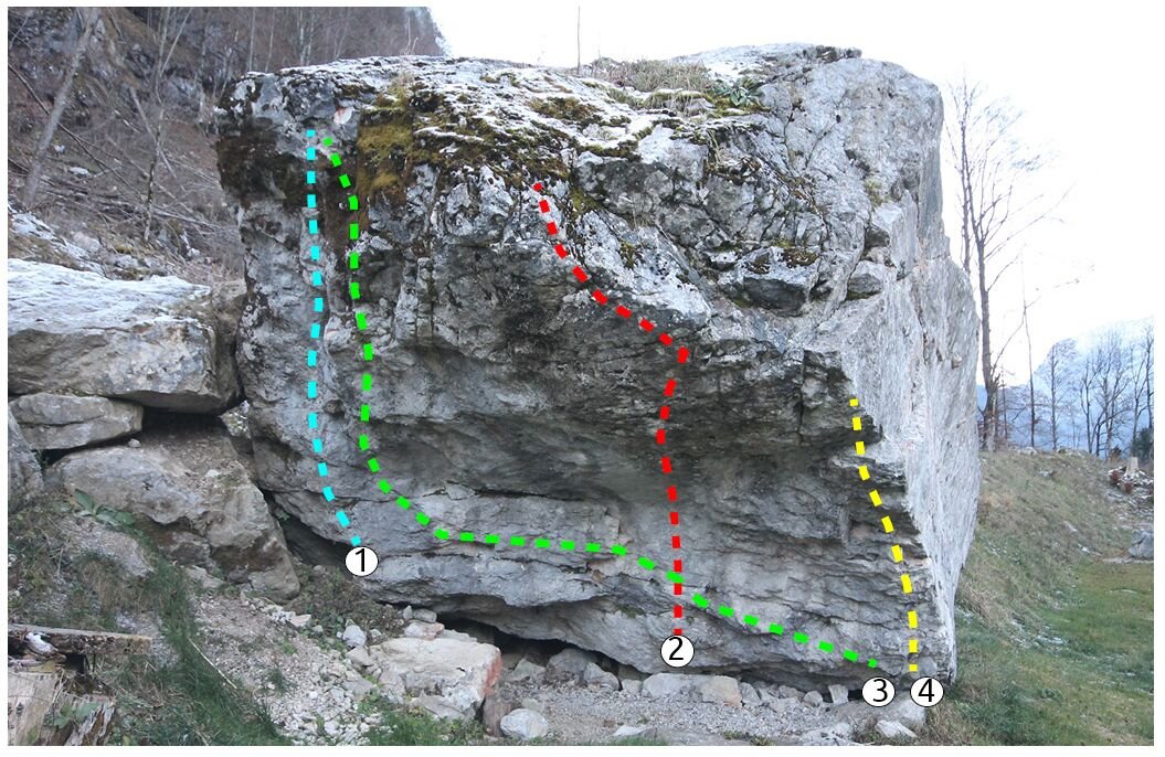 Bei diesem Block sind 4 Boulderprobleme im Schwierigkeitsgrad 6-7 zu bewältigen.