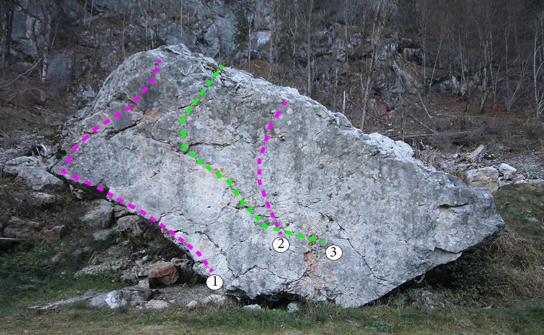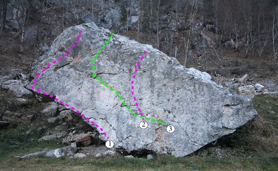 Bei diesem Block sind 3 Boulderprobleme mit einer Schwierigkeit von 6 zu bewältigen.