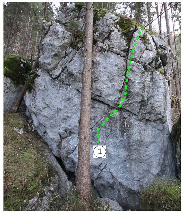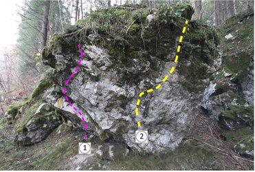 Bei diesem Block sind 2 Boulderprobleme mit einer Schwierigkeit von 7 zu bewältigen.