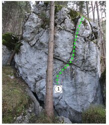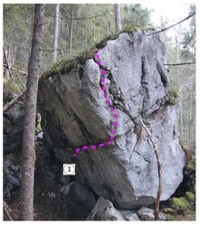 Bei diesem Block ist 1 Boulderproblem mit einer Schwierigkeit von 7 zu bewältigen.