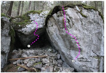 Bei diesem Block sind 2 Boulderprobleme mit einer Schwierigkeit von 8B und 6C zu bewältigen.