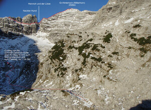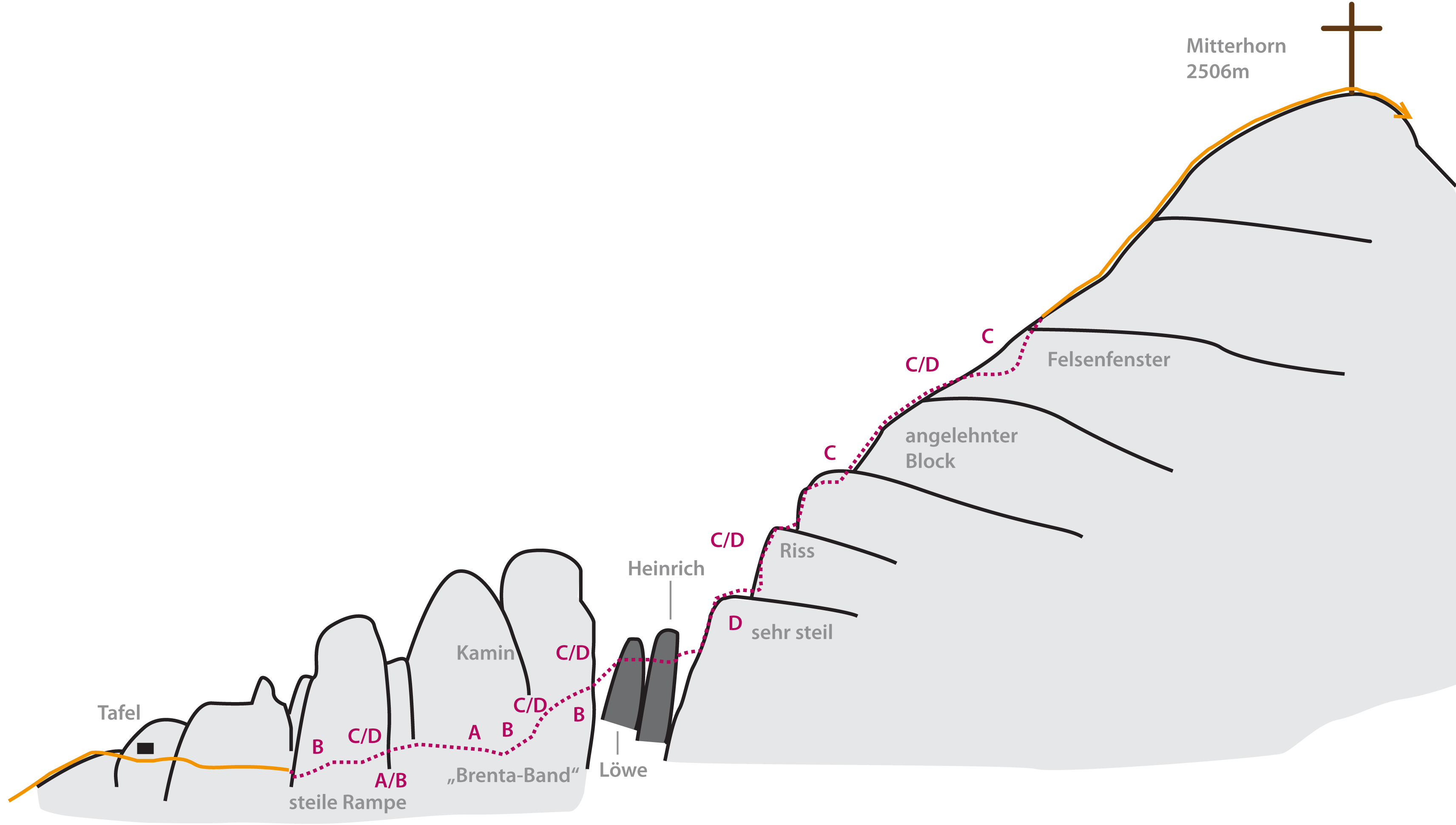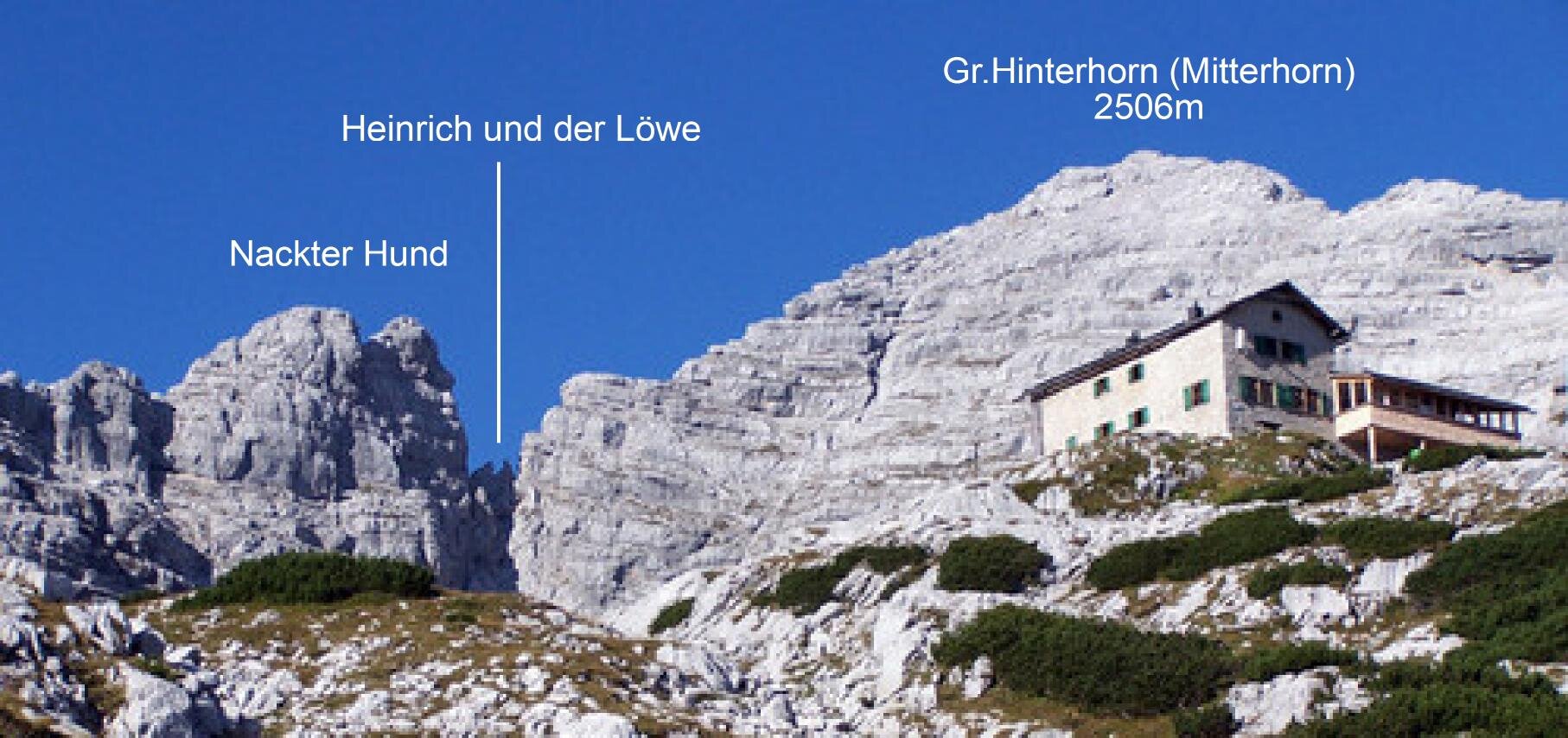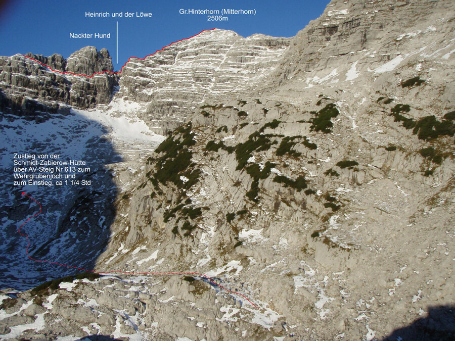 Hochalpiner Klettersteig, der auf einen der höchsten Gipfel der Loferer Steinberge führt. Herrlicher Anstieg vom Wehrgrubenjoch über die Nordseite des Nackten Hundes in die Scharte zum "Heinrich und dem Löwen" und weiter über den Südostgrat auf den Gipfel des Mitterhorns (2504 m) im Loferer Steinberg.
