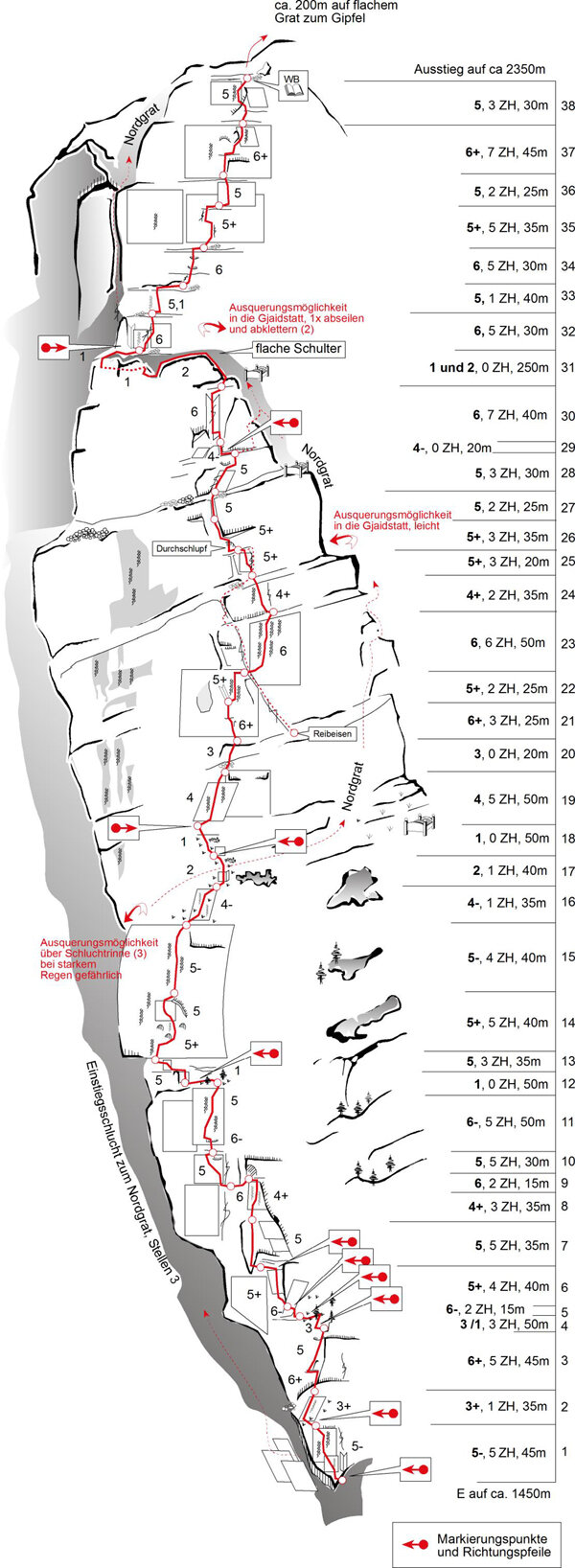 Mit ihren 38SL gehört diese Route zu den längsten Genussrouten in den Ostalpen. In Punkto Homogenität der Felsqualität sowie in der Schwierigkeitsverteilung und Absicherung dürfte sie zu den Toprouten in Österreich zählen. Der durchwegs feste und zum Teil unerträglich raue Fels begeleitet einen durch die ganze Route. Magnesia und neue Kletterpatschen gehören nicht hierher. So manche Querung an den Bändern, einige leichtere Seillängen und auch das Gehgelände auf der großen Schulter im oberen Drittel stören das Gesamterlebnis kaum.