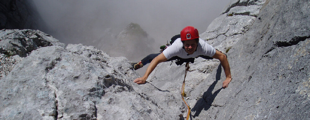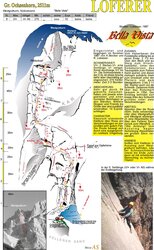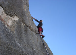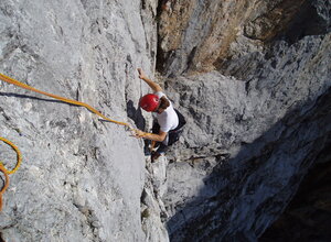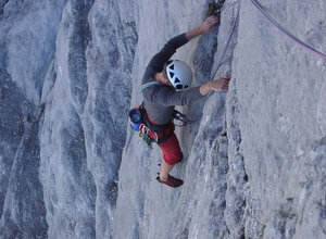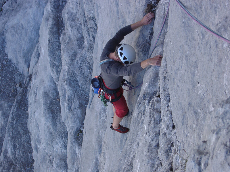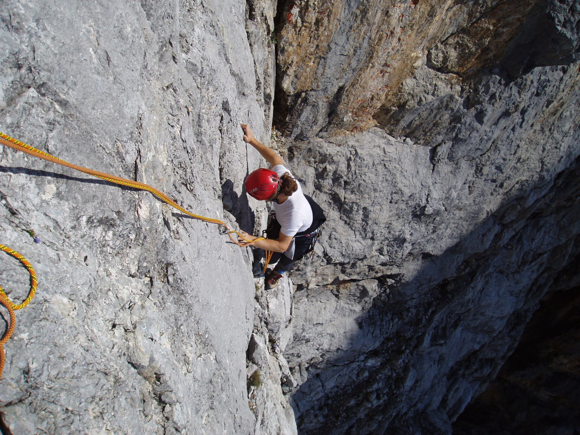 Eine der schönsten, alpinen Sportkletterrouten in der Region. Homogene Schwierigkeiten vom ersten Klettermeter an. Einzig die Unterbrechung nach der 5. SL durch die sogenannte Gipfelrinne verhindert eine Kletterei ganz großen Formats.