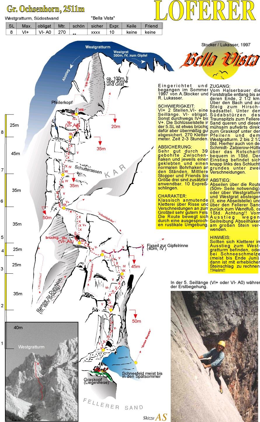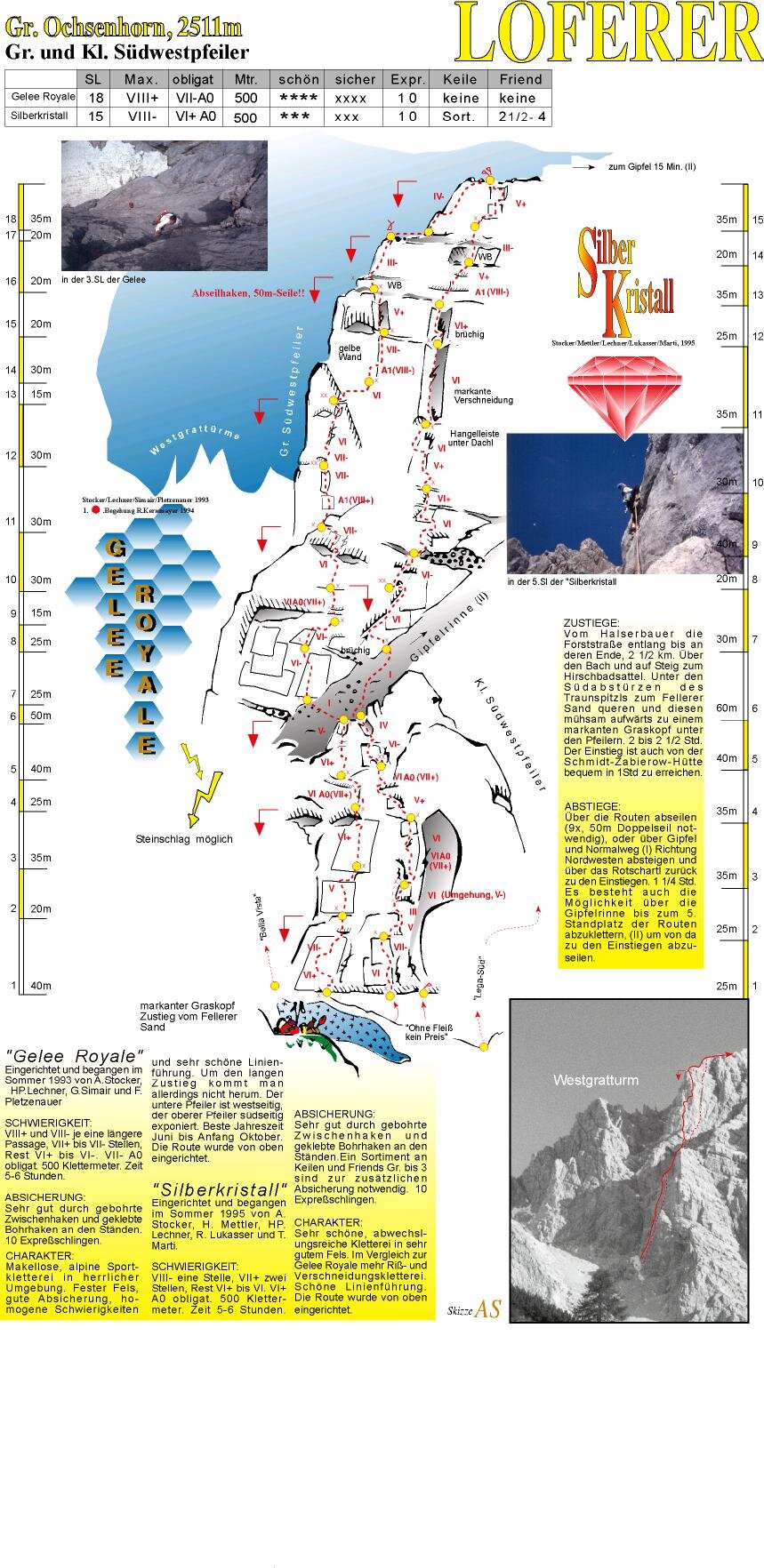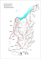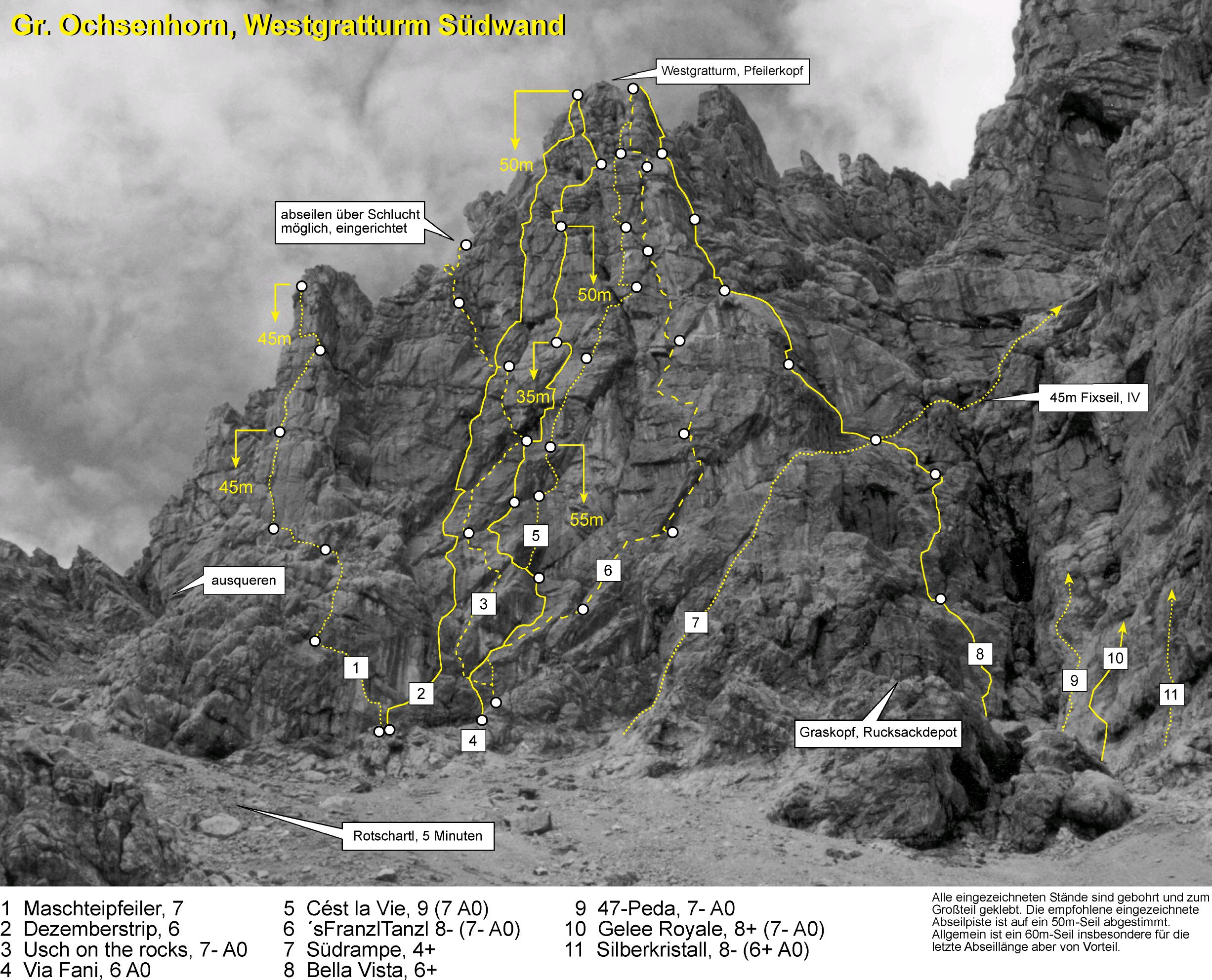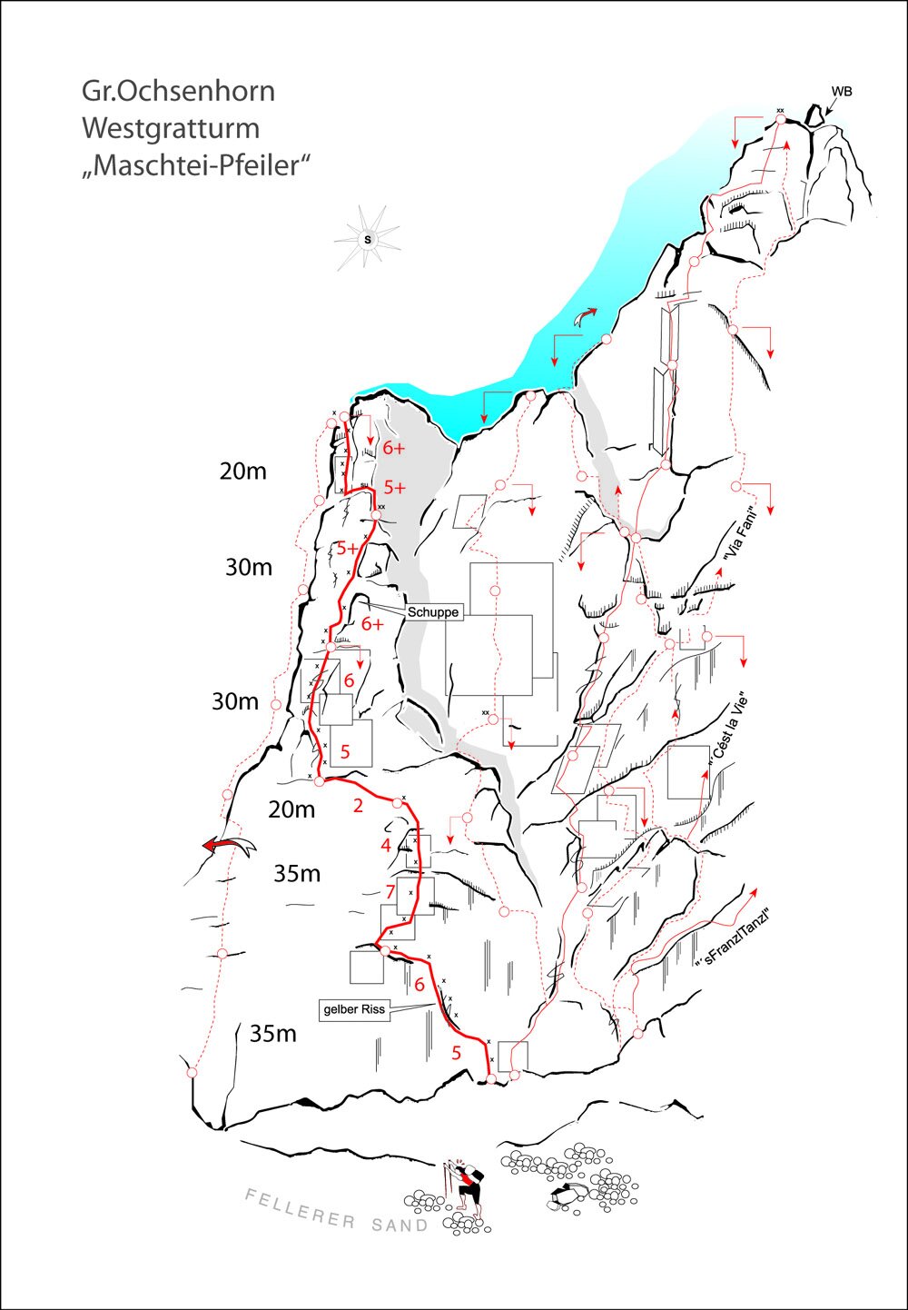 Vom Westgrat des Gr.Ochsenhorns nach Süden abfallende Wand mit ca 300m Höhe. Die Routen führen alle auf einen etwa 50 Höhenmeter tiefer gelegenen Pfeilerkopf. Am besten wird von diesem Pfeiler über die Routen wieder abgeseilt. Ein Ausstieg zum brüchigen Westgrat lohnt sich nicht, sondern verkompliziert nur den Abstieg.