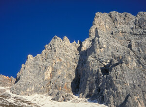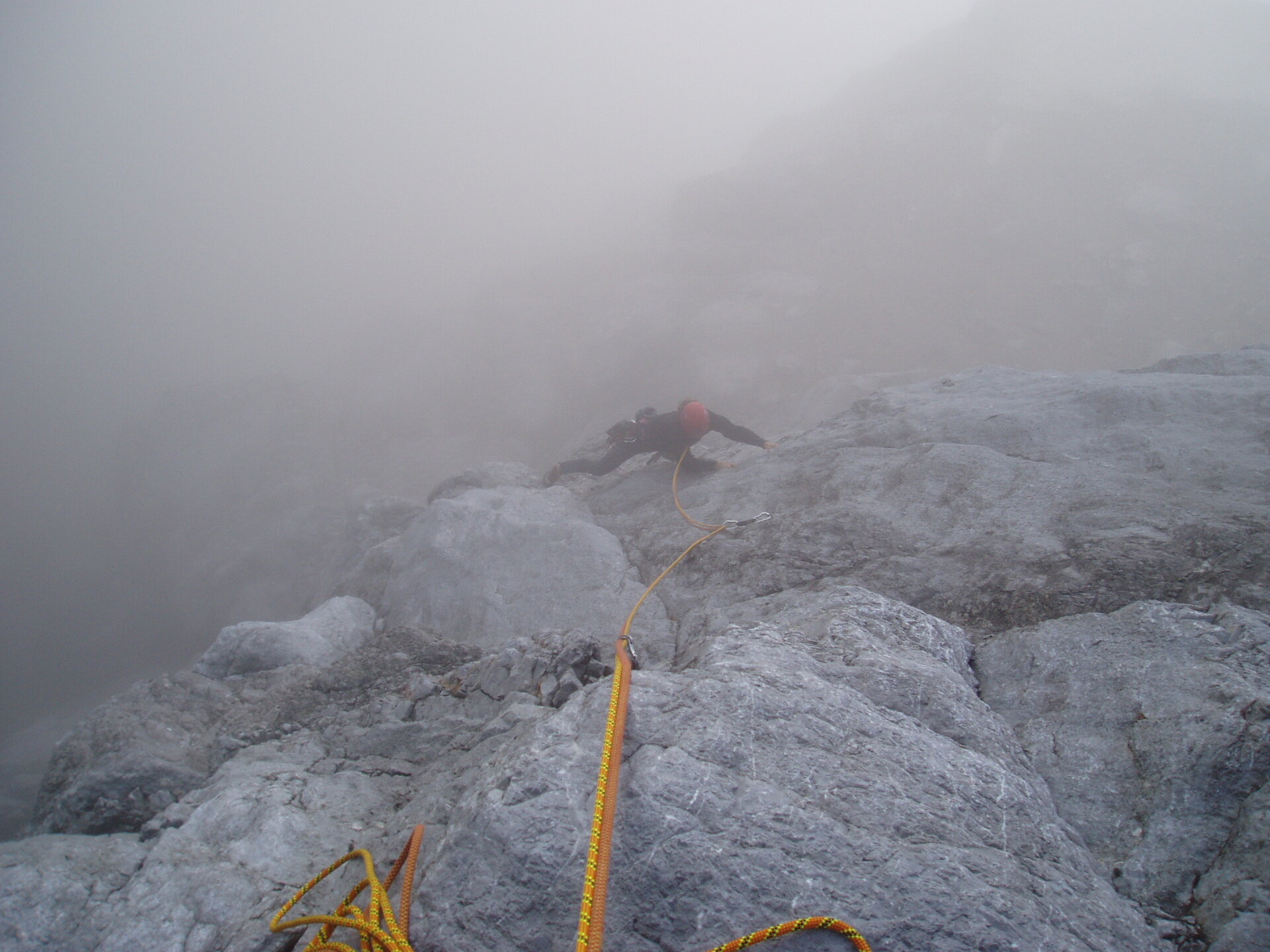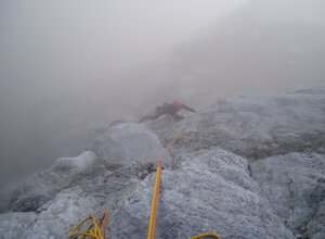 b) Von der 15.SL je nach Seil entweder 6x oder 7x abseilen. Abstiegsgelände in der sogenannten Gipfelrinne!!