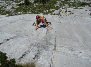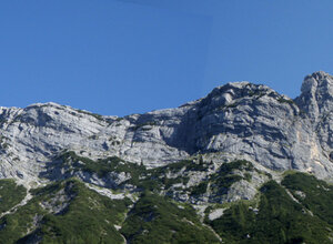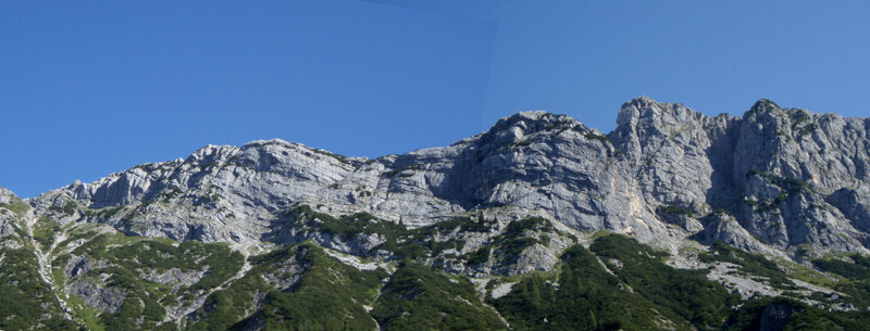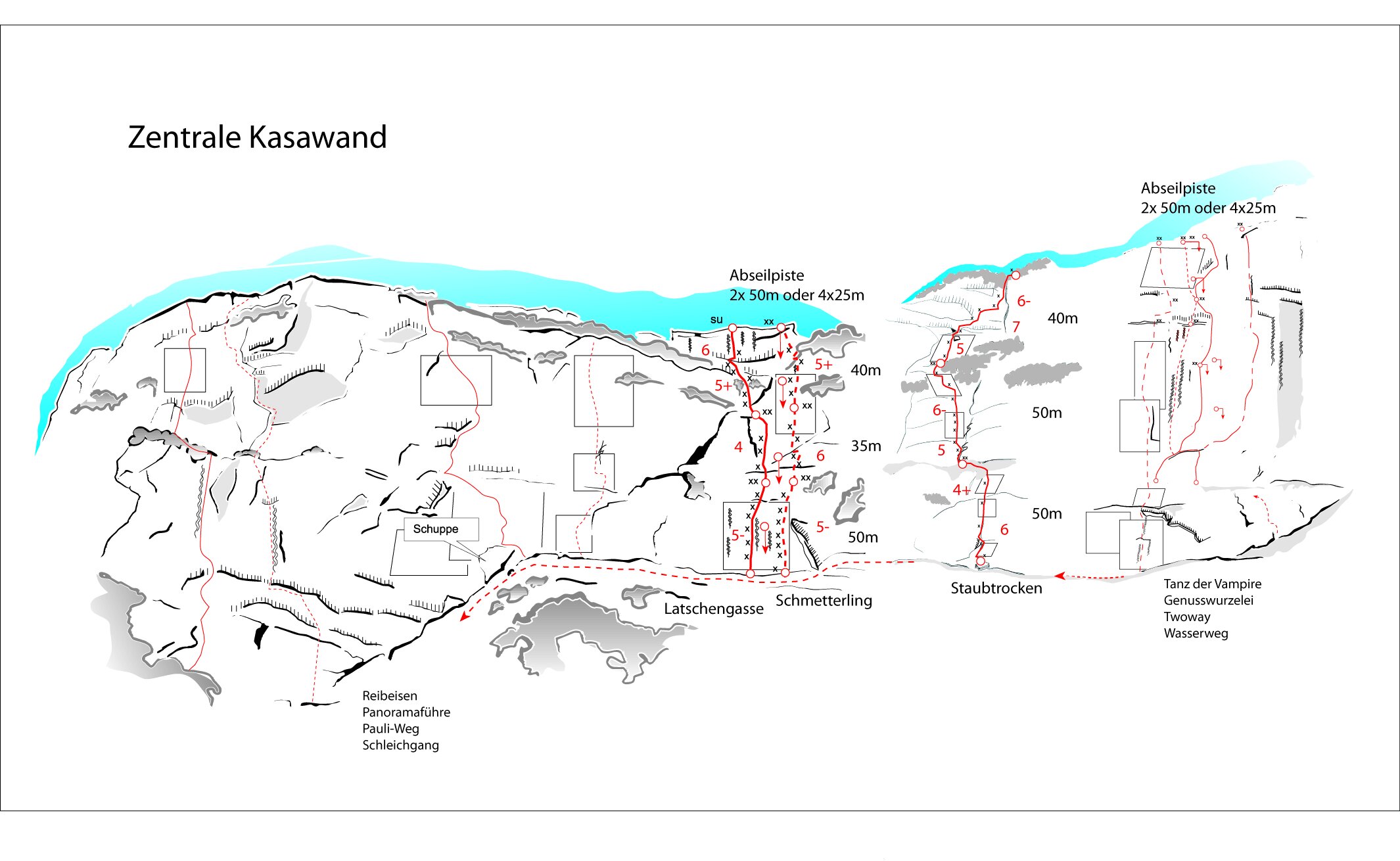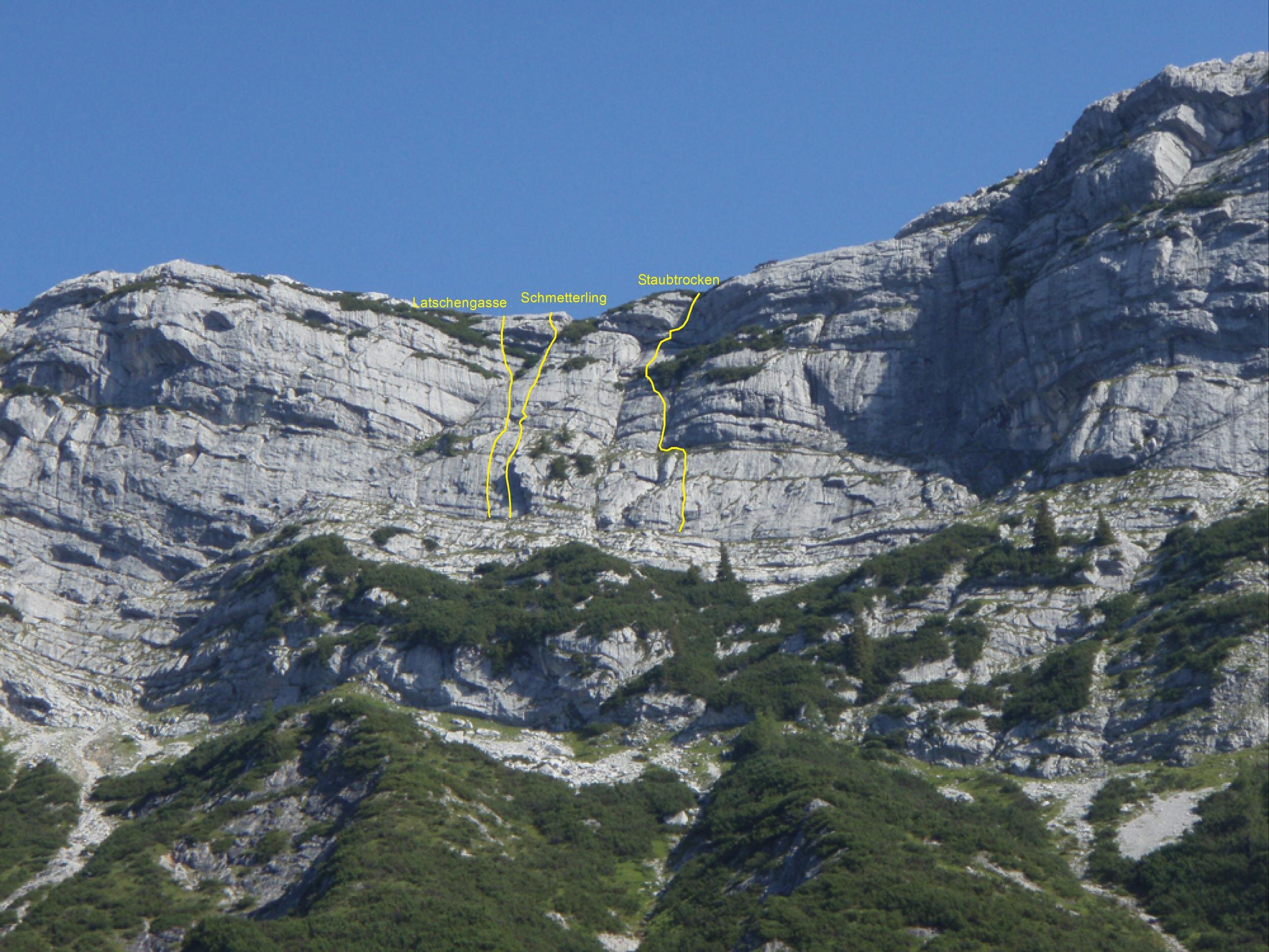 Man folgt kurz der Forststrasse bis man auf den markierten Steig zum Lettlkaser trifft. Auf ihm bis zur Lettlkaser Hütte und weiter dem Steig bis zum Waldanfang hinter der Hütte. Hier erst Steigspruren dann auf gutem Steig immer nach rechts, einige Gräben querend meist horizontal aufwärts. Zuletzt über Schuttreise unter den östlichen Wandabbruch der Kasawand. Linkshaltend unter der Wand querend errreicht man alle Einstiege, 2 bis 2 1/2 Std.