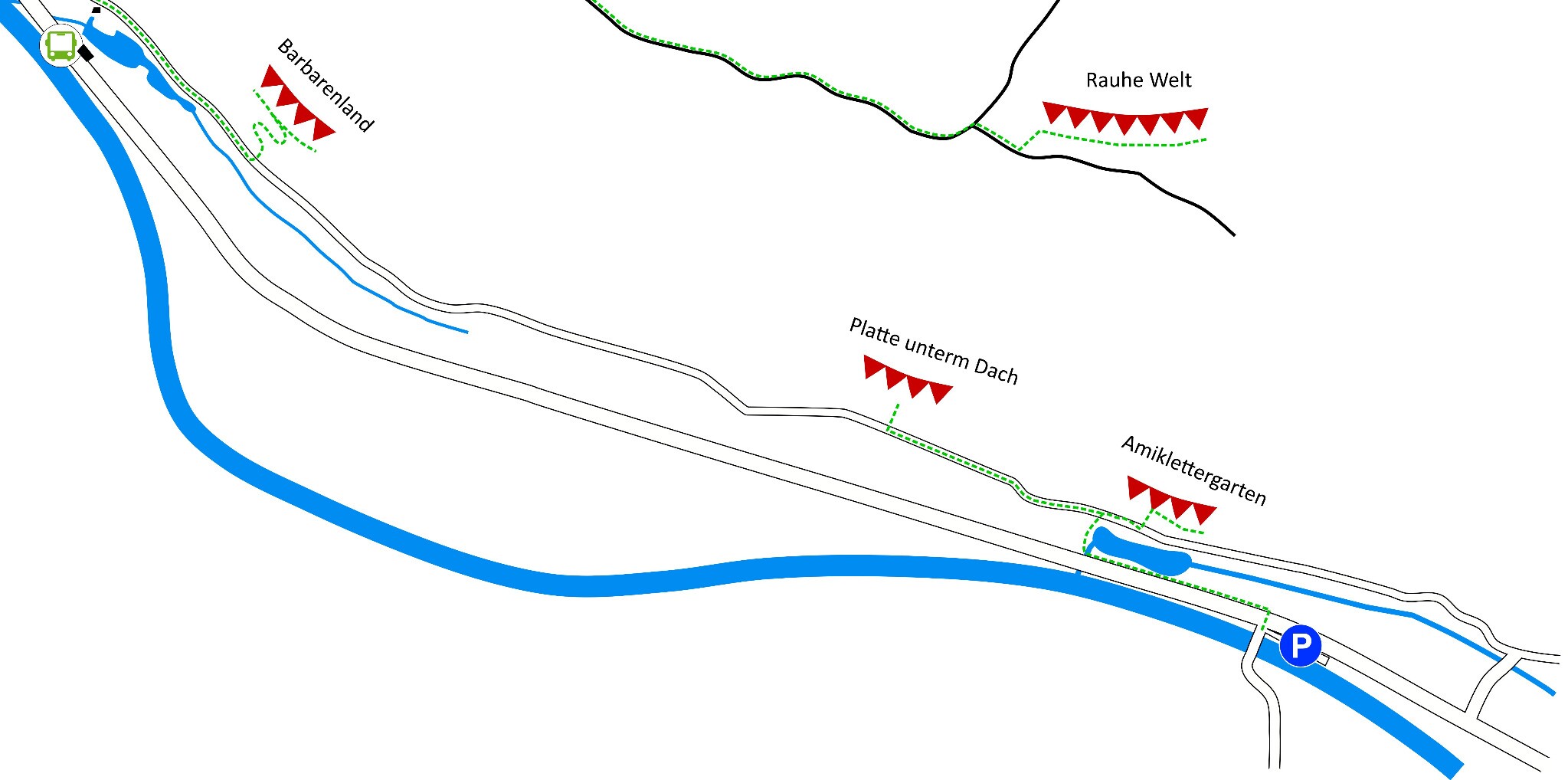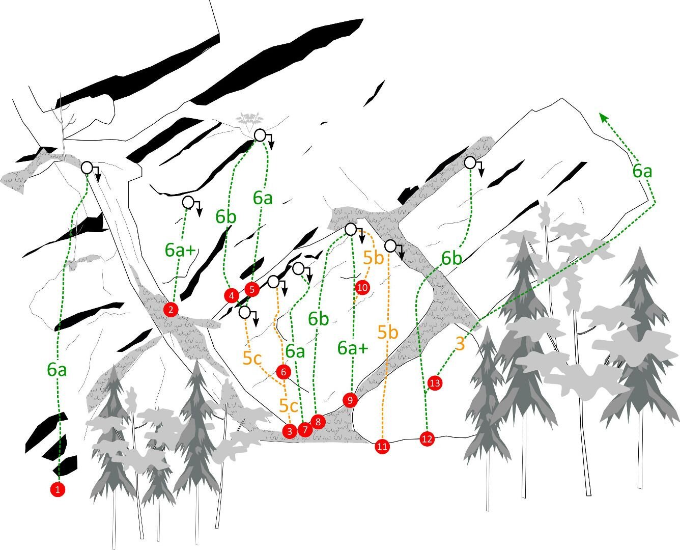 Die Absicherung ist gut bis sehr gut und gerade körperlich nicht so starke KletterInnen werden sich in dem nicht allzu steilen Gelände wohl fühlen. Es wäre aber falsch, die Routen zu unterschätzen, denn es braucht schon eine gute Fußarbeit, um die Routen rotpunkt durchsteigen zu können.