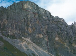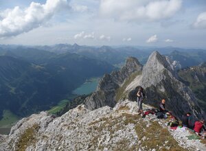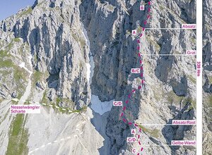 Stellen I–II) zurück zur Tannheimer Hütte. Von dort auf dem bekannten Zustiegsweg