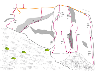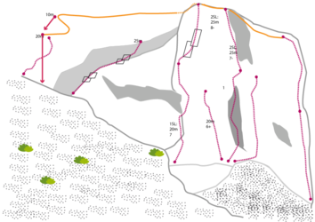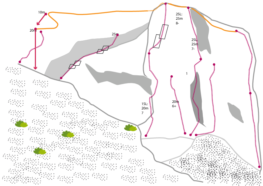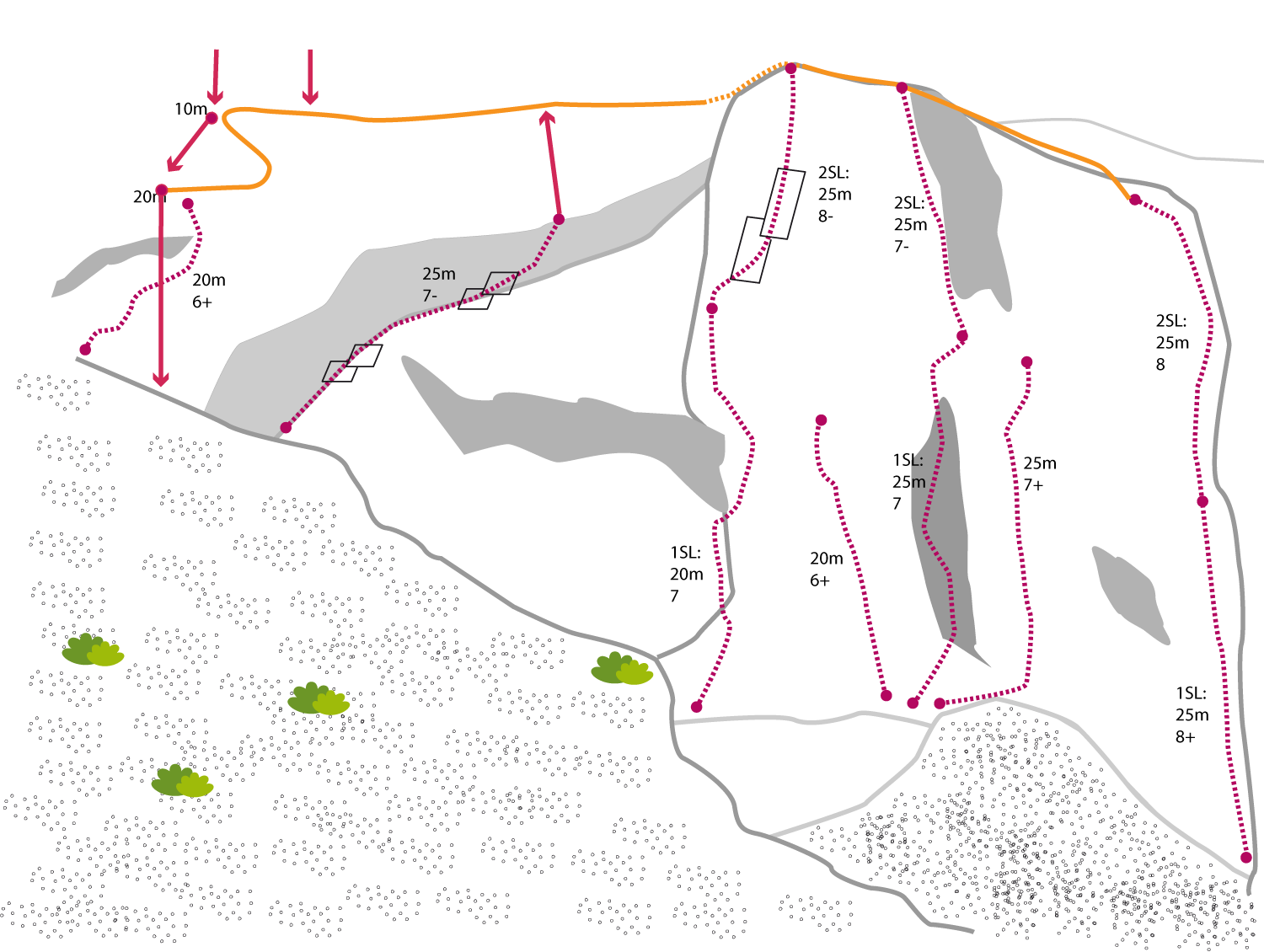 Von beiden Hütten geht man gemütlich in 20-25min zu den Einstiegen.