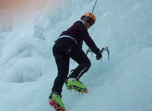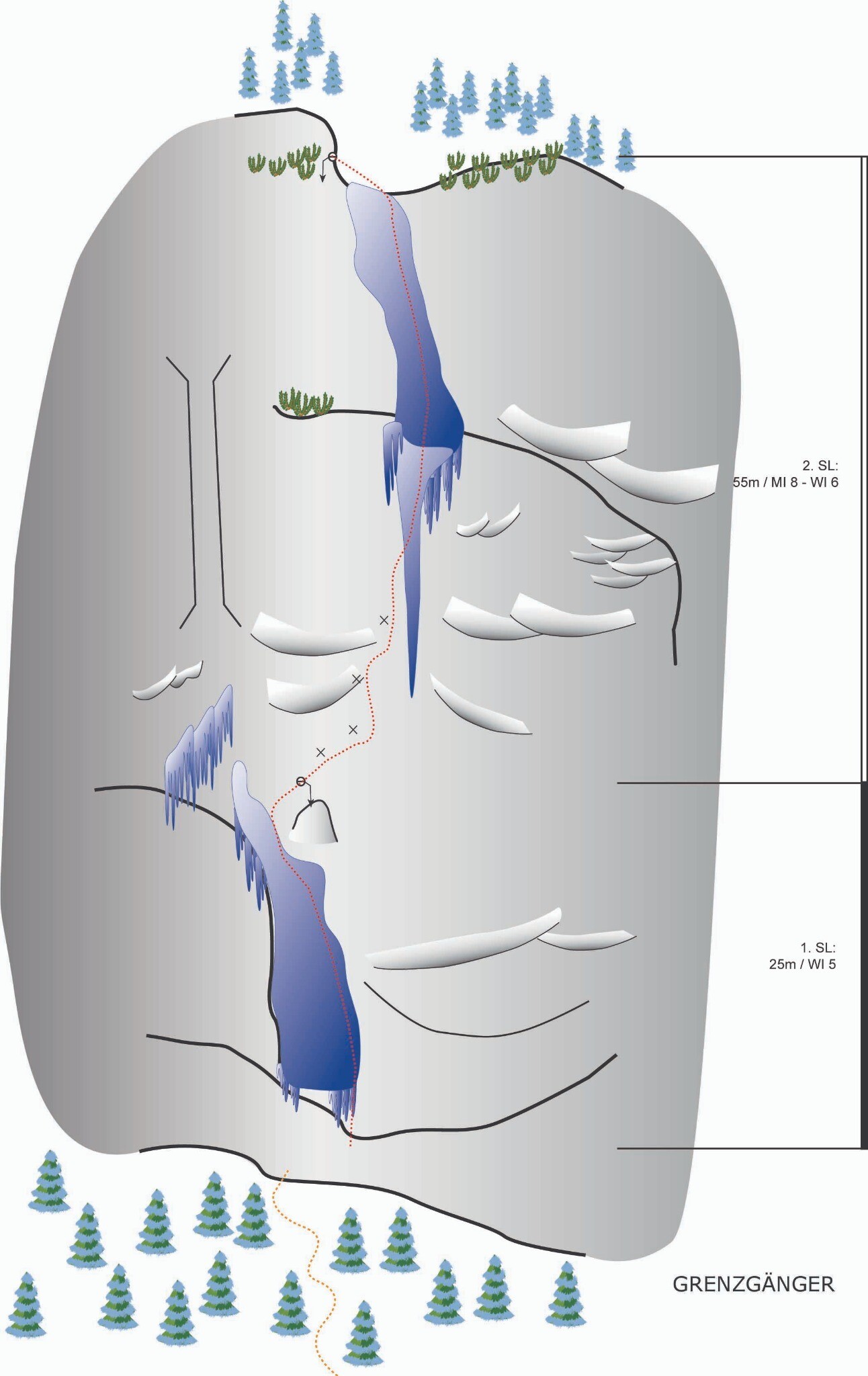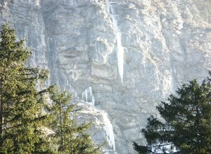 Ein Mixed-Eisfall, der es in sich hat! Direkt von der Straße aus sichtbar, gelangt man in ca. 15 Minuten über den steilen Waldhang hinauf zum 80 m hohen Eisfall. Bis zum 1. Stand handelt es sich um reine Eiskletterei, dann folgt Mixed-Klettern, bis man wieder auf den frei hängenden Eiszapfen steigen kann. Abgeseilt wird über die Route.