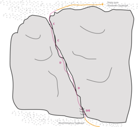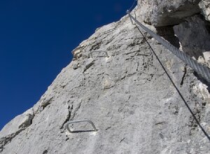 Der eigentliche Klettersteig ist ca. 50m lang und sicherlich mit D wenn nicht mit E zu bewerten. Der Einstieg ist sehr gut zu erkennen, denn Trittklammern und Stahlseil beginnen schon am Wandfuß. Es geht über steile Platten und kleine Überhänge ca. 50m Richtung Gipfel. Die letzten Höhenmeter führen dann über einen steilen Steig durch schottriges Gelände zum Gipfel.Der heftige Aufstieg, mit einem atemraubenden Blick über die Kante, wird mit einem prächtigen Panorama am Gipfel belohnt.