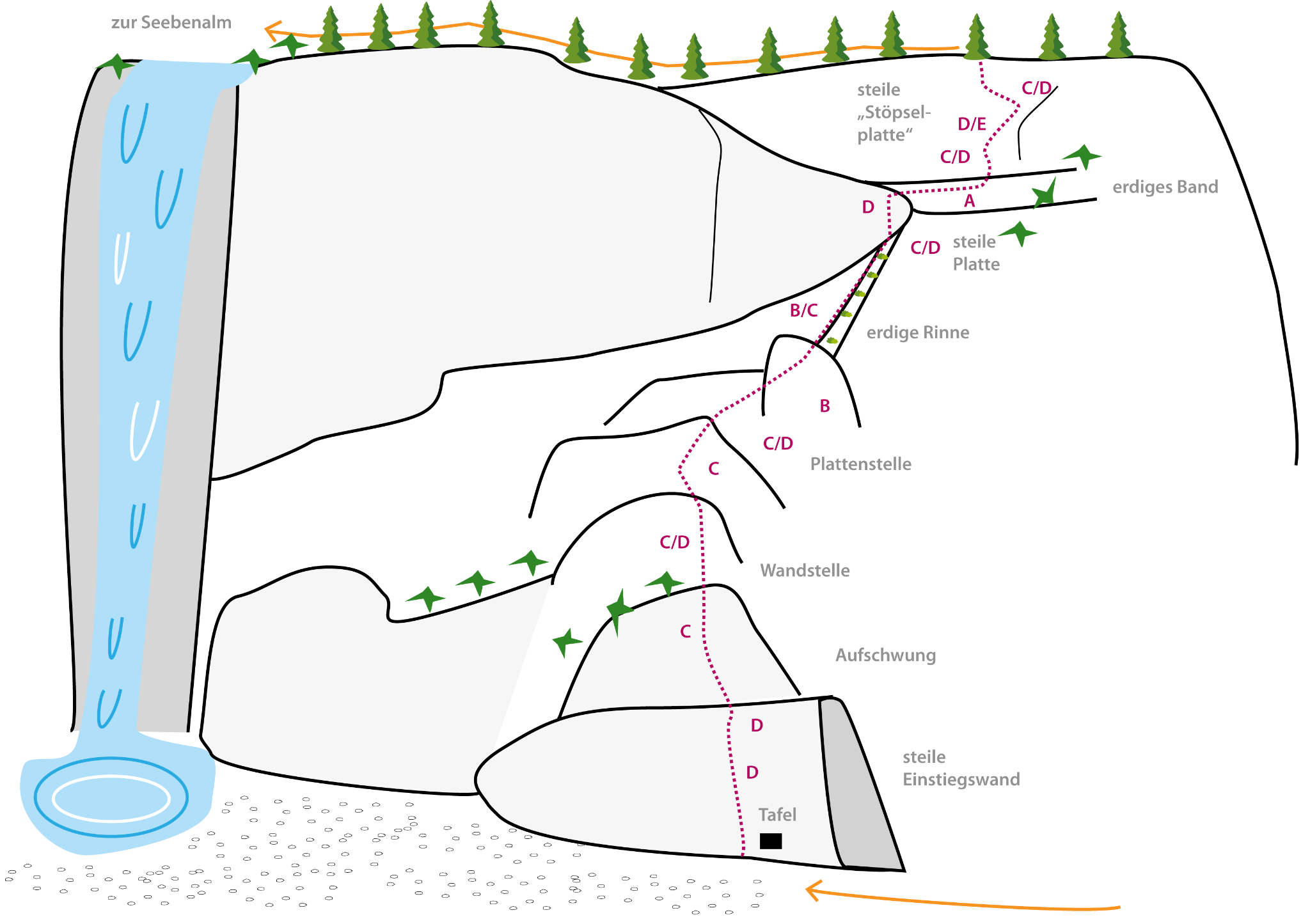 Ein moderner, talnaher Sportklettersteig, der bestens saniert ist und eine gewagte, herausfordernde Route durch die Seebenwände neben dem Wasserfall bietet.