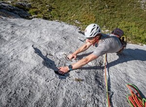 Knackiger Einstieg, grasiger Weiterweg und ein überwältigender Endspurt: Nach oben hin wird die November Sun immer schöner. Der Einstieg ist knapp rechts eines Vermessungszeichens zu finden und fordert gleich ein paar kräftige Kletterzüge. Die eher durchwachsenen folgenden Seillängen sind ab der vierten schnell vergessen: Eine Henkelparade durch eine Steilwand führt zu einer schönen Platte, bei der man mit guter Fußtechnik seitlich unter einem kleinen Überhang vorbei tänzelt. Schöner Move! Wenn die Herbstsonne am Nachmittag noch länger scheint, findet man nach dem Abseilen noch viele weitere Routen direkt nebenan. (c) www.hochzwei.media
