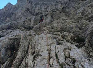 Sehr gut abgesicherte alpine Sportkletterroute in nahezu perfektem Fels. Die Schlüsselstelle ist eine Plattenstelle, welche in einen Überhang übergeht.