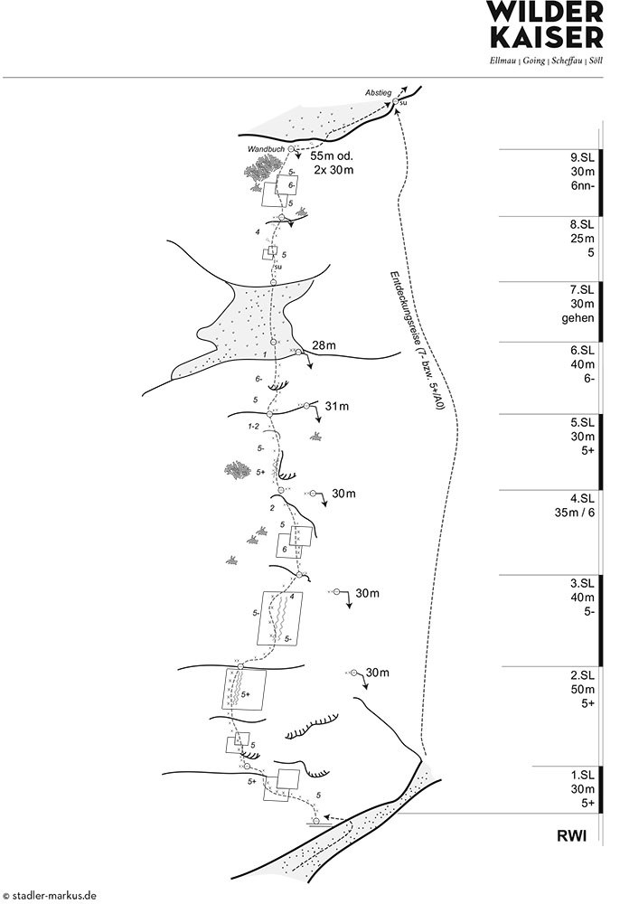 Die Tour bietet eine abwechslungsreiche Kletterei durch Platten, Wasserillen sowie einen kräftigen Überhang und einen Quergang mit Untergriffschuppe.