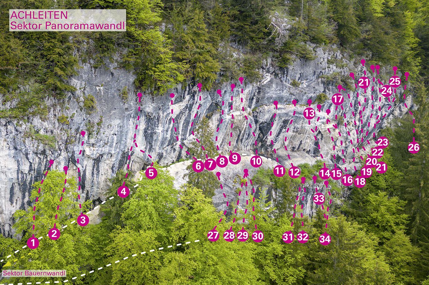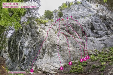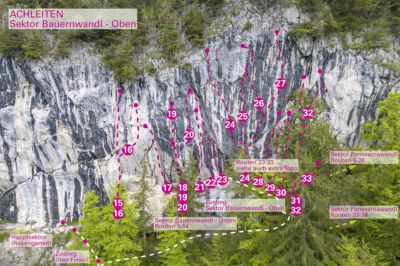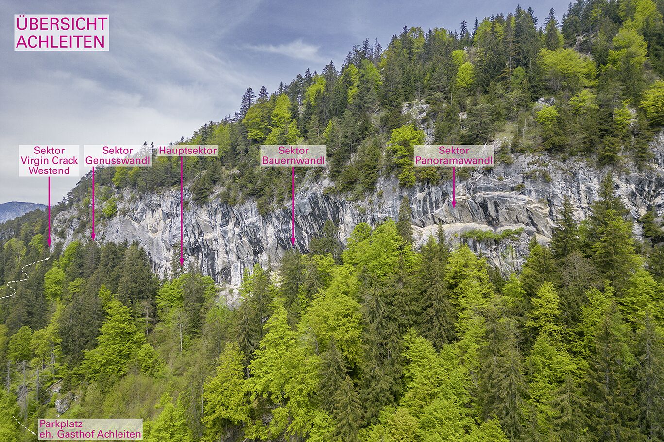 Der Klettergarten Achleiten zählt sowohl an sonnigen Wintertagen als auch in allen übrigen Jahreszeiten zu den Top-Adressen. An richtig heißen Sommertagen findet der Sportkletterer erst in den Abendstunden brauchbare Bedingungen. An der „Fiaggnwand“ warten 5 verschiedene Sektoren mit über 190 Sportkletterrouten in den Schwierigkeitsgraden 3 bis 9a+ auf ambitionierte Kletterer. Die klassischen Routen weisen oft weitere Hakenabstände auf.