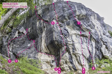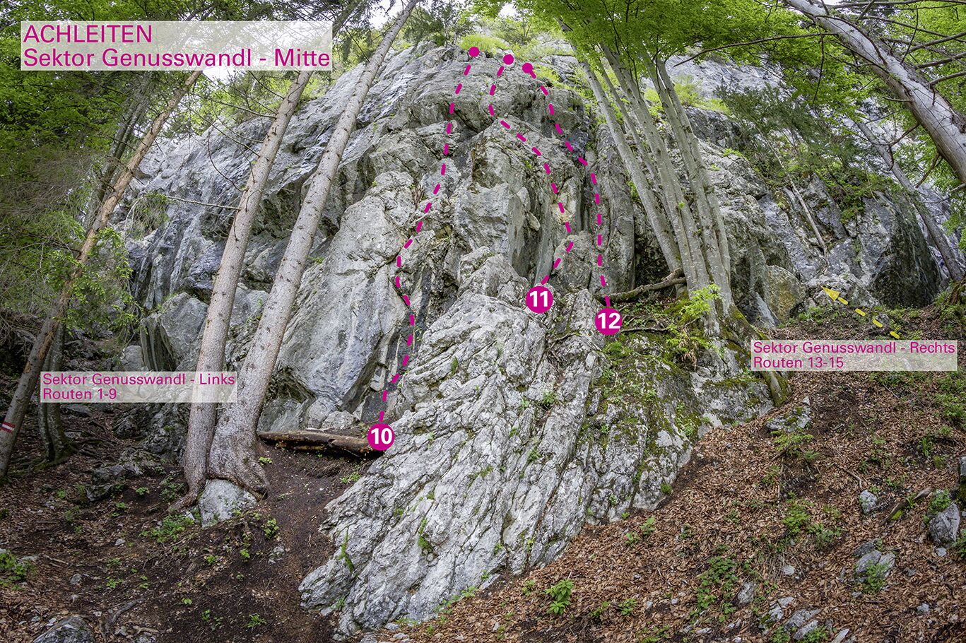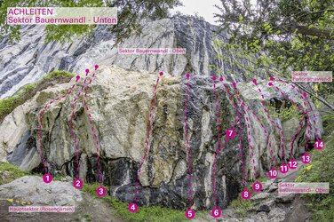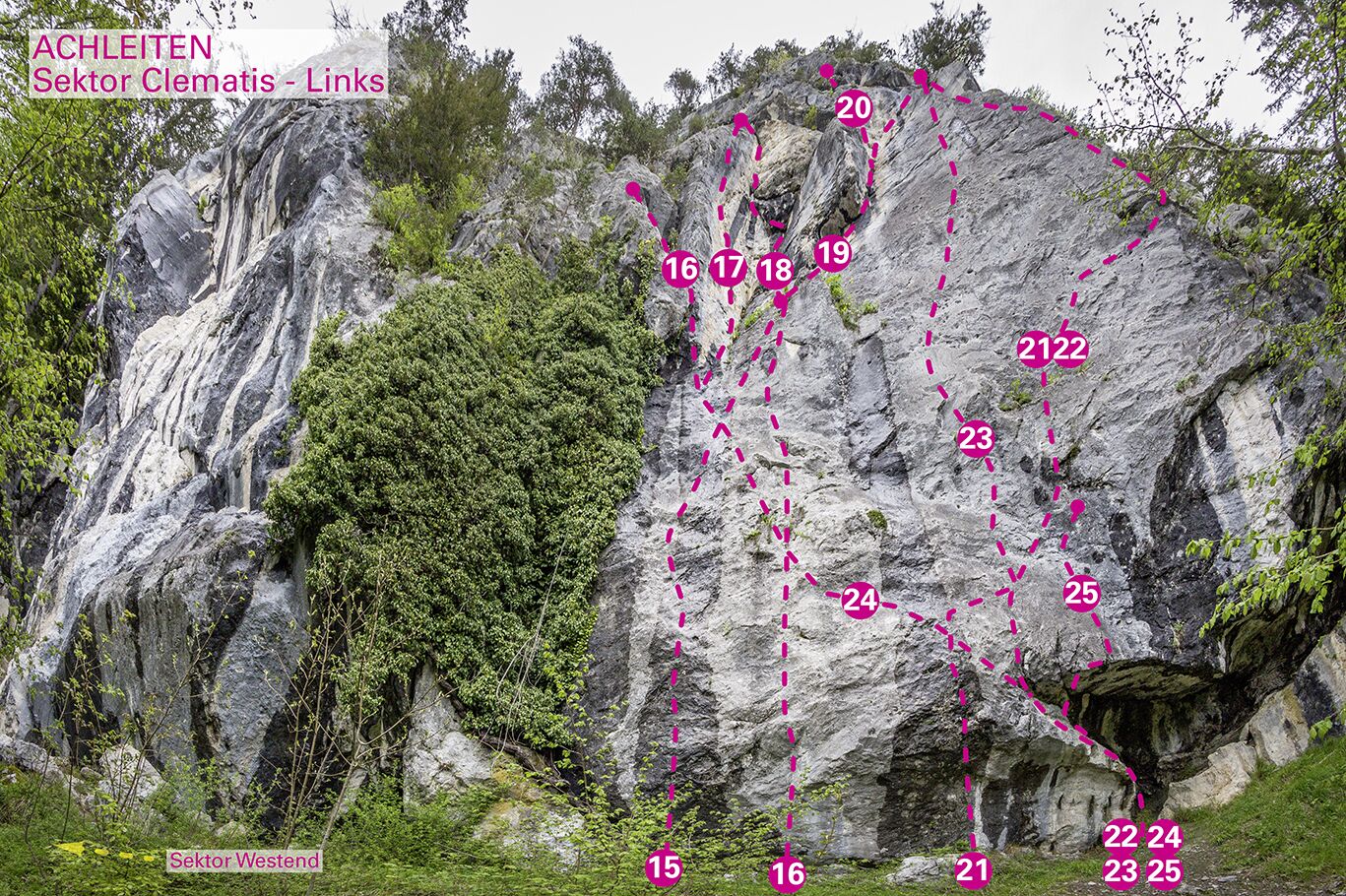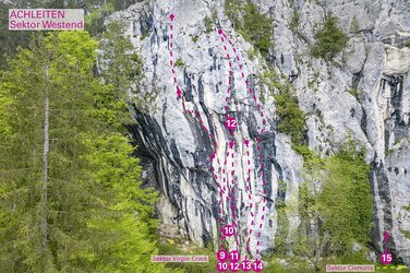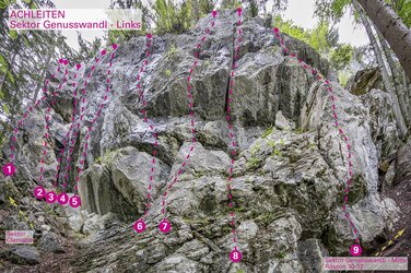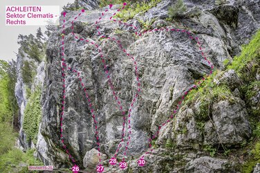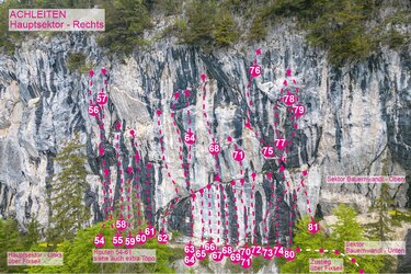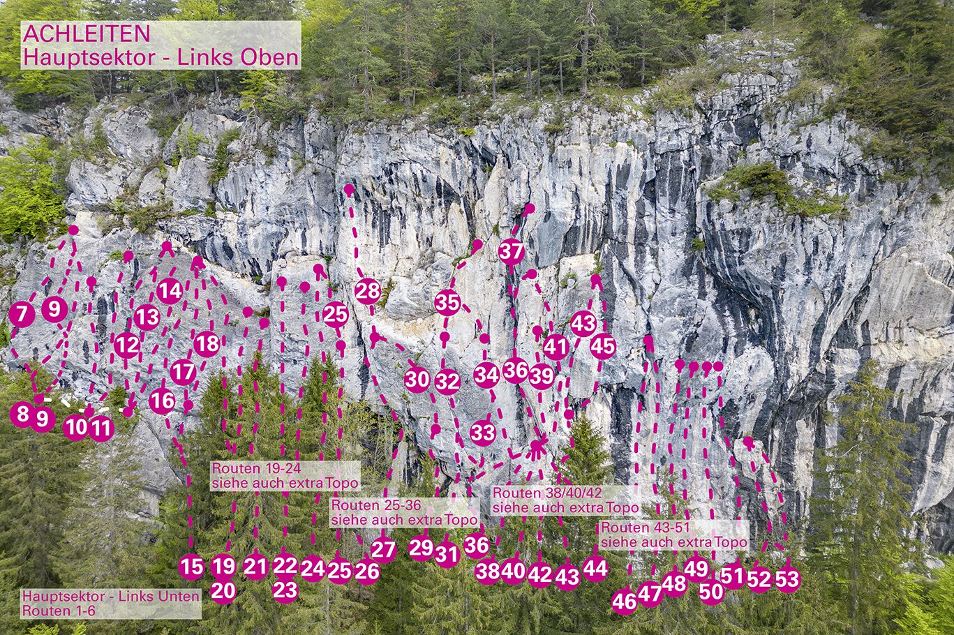 Der Klettergarten Achleiten zählt sowohl an sonnigen Wintertagen als auch in allen übrigen Jahreszeiten zu den Top-Adressen. An richtig heißen Sommertagen findet der Sportkletterer erst in den Abendstunden brauchbare Bedingungen. An der „Fiaggnwand“ warten 5 verschiedene Sektoren mit über 190 Sportkletterrouten in den Schwierigkeitsgraden 3 bis 9a+ auf ambitionierte Kletterer. Die klassischen Routen weisen oft weitere Hakenabstände auf.
